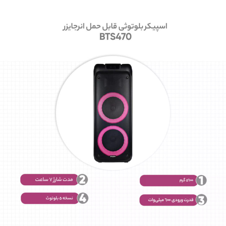 ⭕️اسپیکر بلوتوثی قابل حمل بی سیم انرجایزر مدل BTS470 ✅دارای گارانتی بیش از 12 ماه ✅دارای ورودی میکروفون ✅میکروفون وایرلس ✅ریموت کنترل ✅دارای حالت های نورپردازی LED ✅دارای حالت TWS (اتصال دو اسپیکر همزمان ) ✅ دارای سه افکت نوری حالت پارتی لایت ⭕️سایر مشخصات ✅پورتها بلوتوث \u002F شیار کارت حافظه ✅وزن ۵۶۰۰ گرم ✅ سازگاری سازگار با لپتاپ\u002F تبلت\u002F آیپاد\u002F گوشیهای هوشمند ✅بلوتوث \u002F ورژن و ویژگی دارد \u002F نسخهی 5.0 ✅ توان خروجی ۳۰ وات ✅بازدهی باتری میانگین حدود 5 الی 6 ساعت