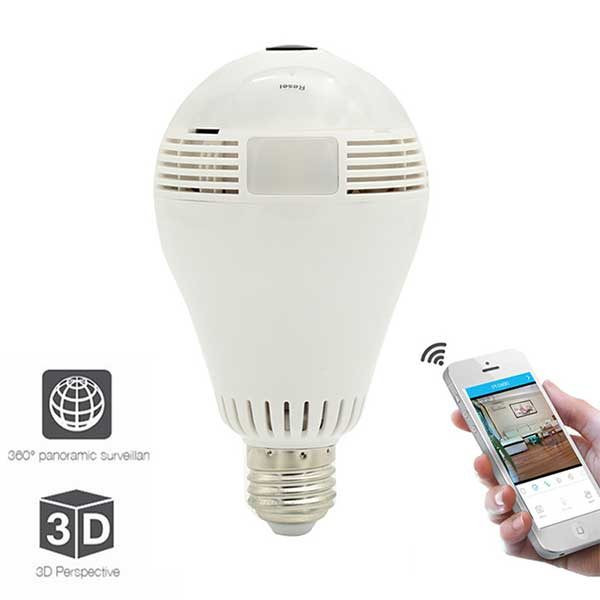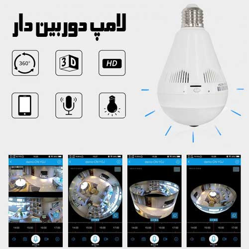 دوربین مداربسته لامپی ۳۶۰ درجه WIFI رم خور دارای تصویر پانوراما با رزولوشن دو مگاپیکسل واقعی 1080 FULLHD می باشد که زاویه دید وسیع 360 درجه که حدود 50 متر مربع را بطور کامل پوشش میدهد و دارای دید در شب خوب که قادر به تصویر برداری در تاریکی مطلق میباشد و دارای اسپیکر و میکروفن جهت انتقال صدای دو طرفه اینترنتی و قابلیت نصب کارت حافظه برای دخیره سازی تصویر همراه با صدا در محیط میباشد که هم بصورت 24 ساعته و هم به صورت حرکتی ( زمانی که حرکتی انجام شد ضبط کنه ) قابل تنظیم میباشد.