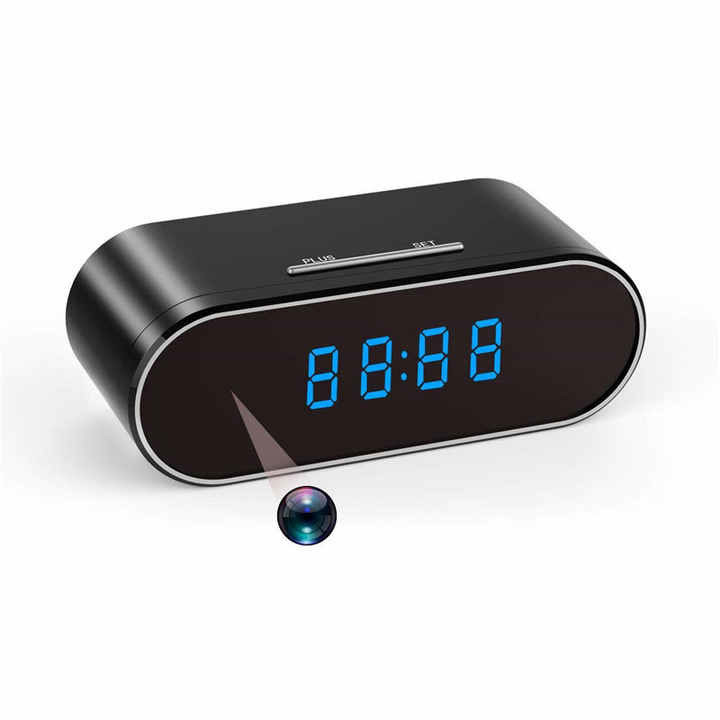 دوربین ساعتی رومیزی مخفی شامل یک لنز گسترده جهت دید بهتر ،چراغ های LED در جلوی ساعت می باشد.دکمه های PLUS , SET بر روی ساعت درج شده است .به کمک دکمه PLUS ساعت جاری را تنظیم می کنیم و با زدن دکمه SET تنظیمات ساعت ذخیره می شود . دکمه های ON/OFF،پورتUSB و کارت حافظه در پشت ساعت قرار دارد.یکی از قابلیت های خوب این دوربین انتقال تصویر دوربین ساعتی می باشد که شما می توانید از راه دور تصویر و صدای محیط خود را داشته باشید که نسبت به قیمت دوربین های مدار بسته معمولی از قابلیت های بیشتری برخوردار است که در ادامه به آن پرداخته می شود.